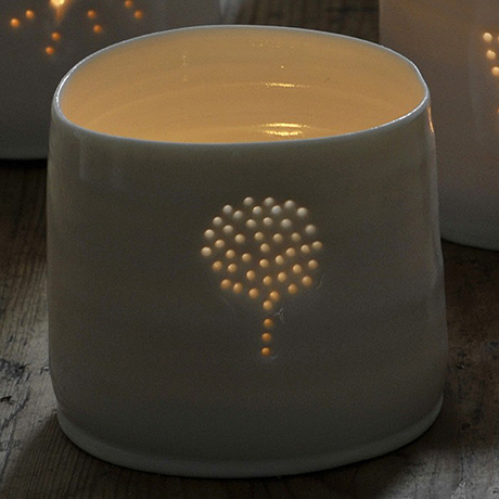 Wonderful for the mantlepiece, on the dining table or in the garden are the enchanting fine porcelain tea light holders, the Luna Minis. Each is hand thrown and decorated with tiny hole topiary patterns that give a magical flickering glow. Natural ivory white porcelain with glossy transparent glaze.