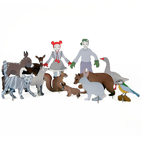 Eight A4 sheets printed with a boy, a girl, a cat, bear + baby bear, donkey, a deer, a goat, a dog, a goose and a little bird. Once popped out, they’ll make great templates to draw on. Slide them into their little stands and the figurines will come to life and participate in endless fantasy stories. One side of the figurines is printed – the other side is left blank to draw yourself. They are made of sturdy recycled cardboard Ages 3+. 10 x Figurines.